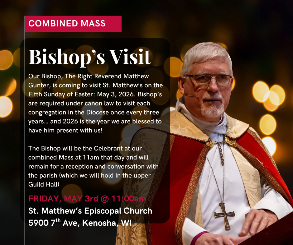 Join us on Sunday, May 3rd at 11:00am for a COMBINED MASS celebrating the Bishop’s Visit to St. Matthew’s