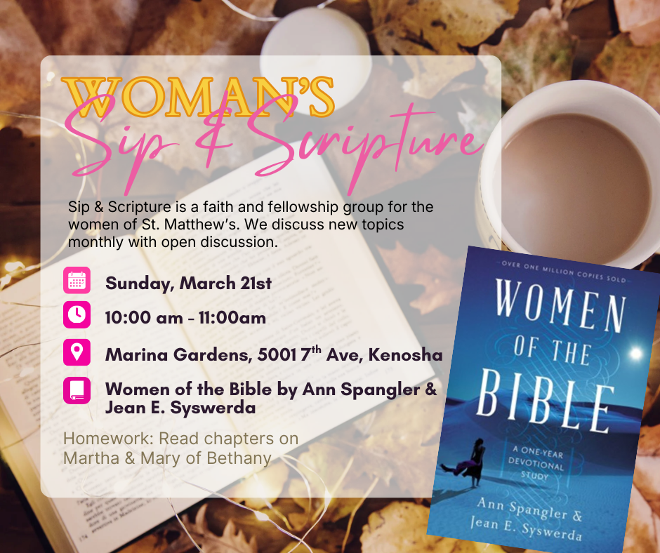Sip & Scripture is a NEW faith and fellowship group for the women of St. Matthew’s. We will have new topics to discuss monthly with open discussion. We are reading... |